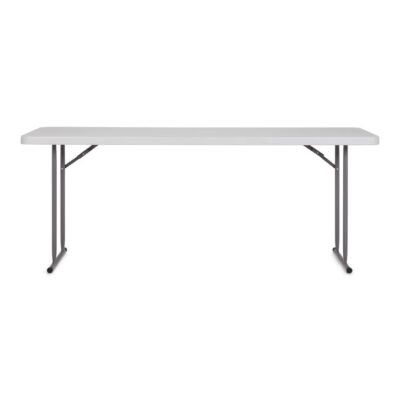 Mesa plegable con estructura de acero pintado sobre de polietileno de alta densidad, en color gris claro. Grosor sobre 45 mm. Sobre estanco de una sola pieza sin uniones. Peso neto 19,80 kg. Travesaños ergonómicos.