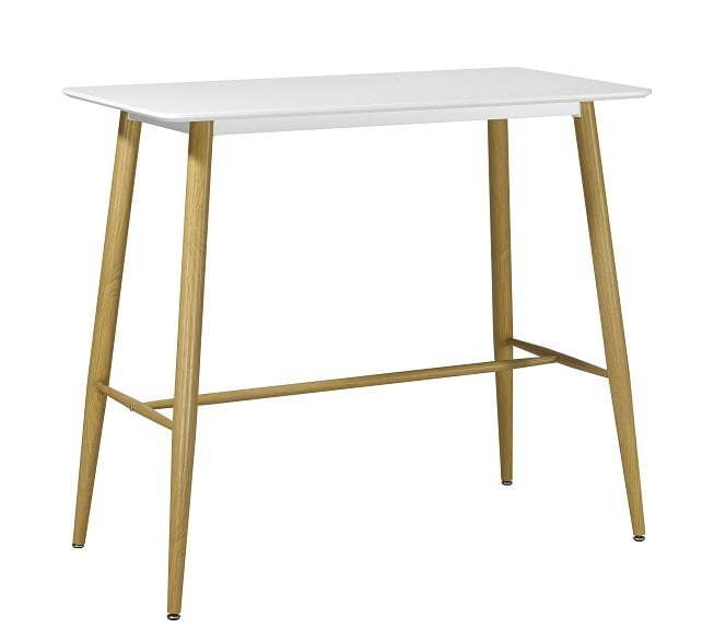 Mesa alta rectangular de diseño. Armazón metálico acabado imitación madera.