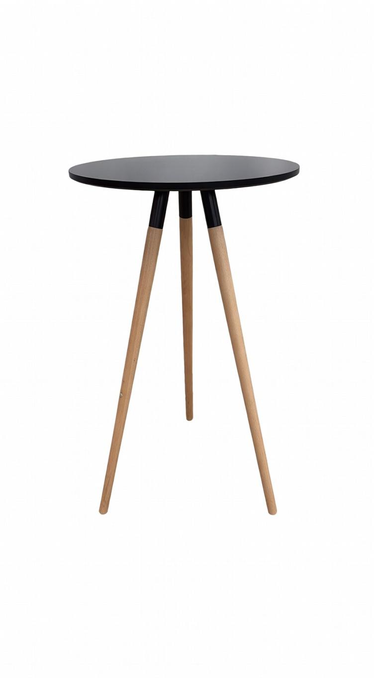 -Mesa de diseño, alta, multiusos. Base con patas de madera de haya maciza y reposapiés metálico con acabado epoxi. Tapa de madera lacada en negro, formato redondo.